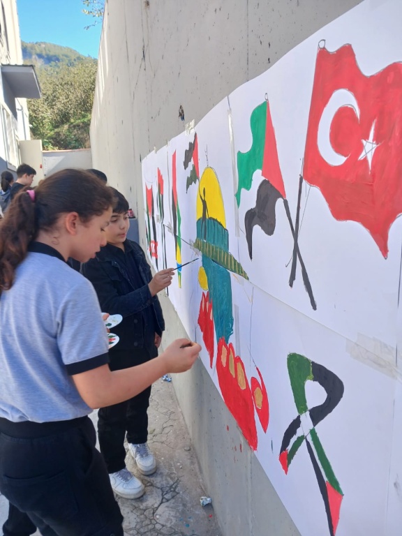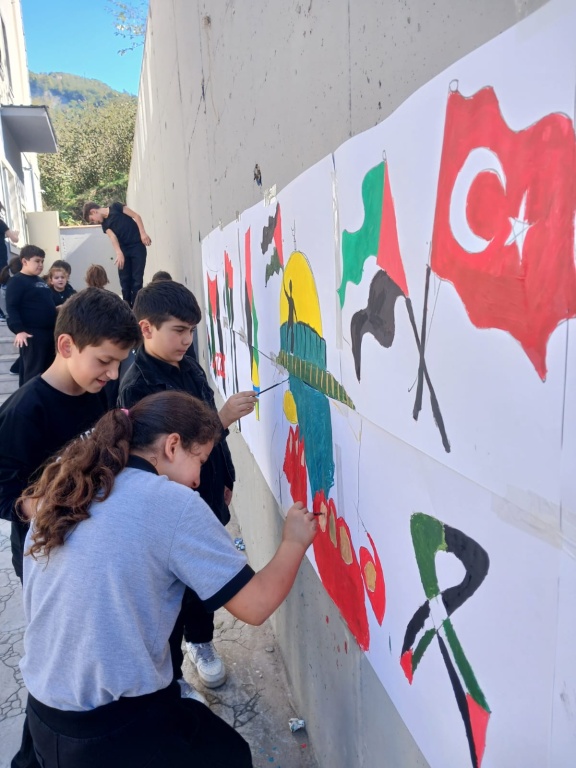 Okulumuzda bugün, Filistin’de yaşanan zulme dikkat çekmek ve mazlumların sesi olmak amacıyla anlamlı bir etkinlik gerçekleştirdik. Öğrencilerimiz, kalplerindeki duygu ve düşünceleri rengârenk fırçalarla kâğıda dökerek Filistin temalı büyük afişler ve posterler hazırladılar.